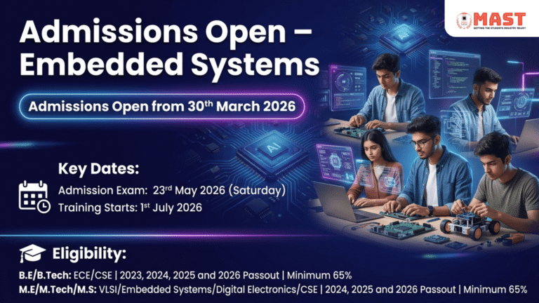 Bring the change by joining the world-class industry-oriented Embedded Systems training program offered by MAST. Purchase Note: This is the Enrollment fee we request you to pay only if you have been selected via the written & Interview Process. Make sure that you have the official confirmtaion from the Institution on your enrolment. If everything is in place, Welcome to MAST.